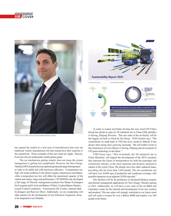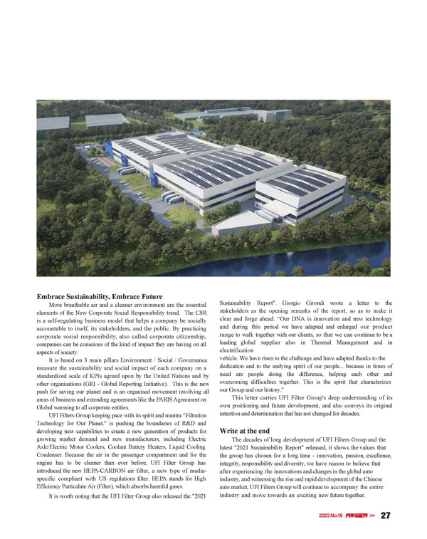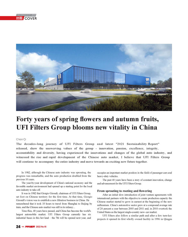 采訪還提及UFI濾清器集團(tuán)發(fā)布了“2021年可持續(xù)發(fā)展報告”,這與UFI濾清器集團(tuán)的理念完全吻合,其愿景是用先進(jìn)的過濾技術(shù)用“芯”守護(hù)星球。正如UFI濾清器集團(tuán)董事長Giorgio Girondi在報告開篇中所說,我們始終以人為本,而這也正是集團(tuán)的精神傳承。