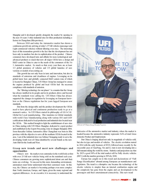 UFI濾清器集團(tuán),業(yè)內(nèi)領(lǐng)先的過濾與熱管理公司,在慶祝其中國分部成立40年之際,UFI濾清器集團(tuán)首席執(zhí)行官Rinaldo Facchini和UFI濾清器集團(tuán)亞太區(qū)首席運營官Simone Trazzi接受了中國汽車媒體“汽車與配件”的采訪,分享了集團(tuán)在中國不斷創(chuàng)新、變革和與時俱進(jìn)的故事。