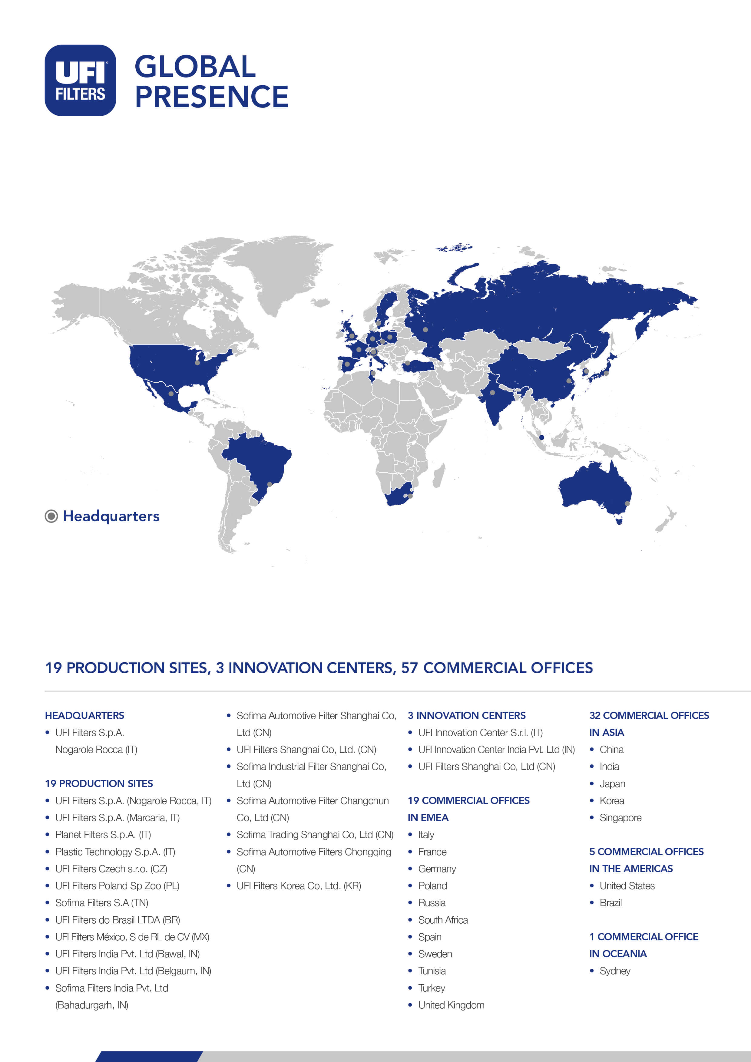 得益于領(lǐng)先的產(chǎn)品系列,包括完整過濾模塊、熱管理系統(tǒng)、零配件和過濾介質(zhì),集團(tuán)深受世界汽車品牌的認(rèn)可與信賴,如大眾集團(tuán)、Stellantis、通用汽車、福特、日產(chǎn)雷諾、現(xiàn)代起亞、寶馬、戴姆勒股份公司、三菱FUSO、曼恩、凱斯紐荷蘭工業(yè)、沃爾沃和斯堪尼亞等品牌。目前,全球95%汽車制造商選擇將UFI集團(tuán)的產(chǎn)品系列應(yīng)用于其傳統(tǒng)動(dòng)力、混合動(dòng)力和電動(dòng)車型。