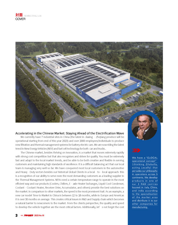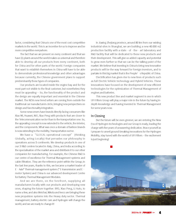 目前,我們?cè)谥袊?guó)擁有7個(gè)工業(yè)基地,最新的工廠位于浙江省嘉興市,預(yù)計(jì)將于2023年年底開始運(yùn)營(yíng)。我們現(xiàn)有2000多名工作人員,專注于為電動(dòng)汽車生產(chǎn)新型的過濾和熱管理系統(tǒng),以適應(yīng)新能源汽車及燃料電池汽車和卡車的發(fā)展趨勢(shì)。