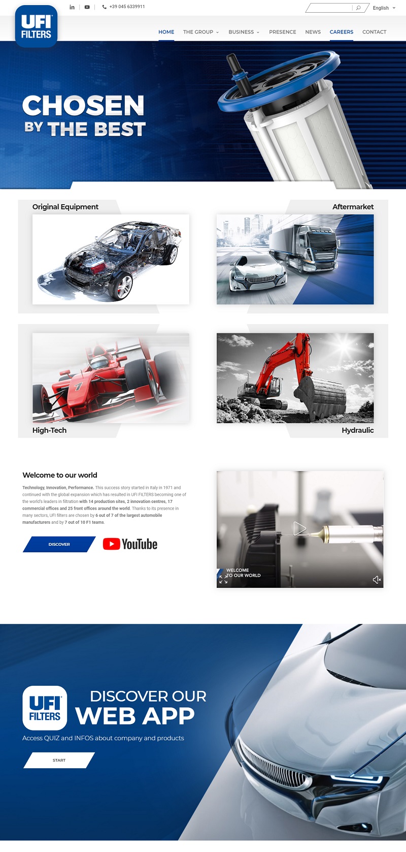 Rinaldo Facchini, CEO of the UFI Filters Group, confirms: “It is with great pleasure that we announce the launch of our new websites. I believe that these tools demonstrate the undisputed reputation earned by our company, as well as communicating the international growth and positioning of UFI as a global player. The new sites deliver great visual impact and will let everyone know about the technological innovations that we can offer on a worldwide scale.”