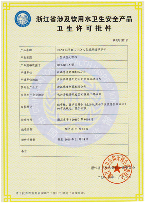 德恩特品牌全系凈水機已通過中國疾病預防控制中心環(huán)境與健康相關產品安全所檢驗合格。本月底將全獲得凈水機生產國家衛(wèi)生批件。